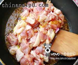 4、加入鸡腿肉、白糖,翻炒2分钟;