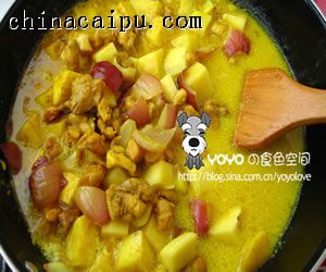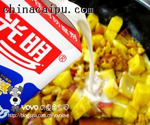 6、加入土豆翻炒均匀,所有材料移至大锅,倒入肉骨汤和一大盒牛奶,以没过全部食材为止;