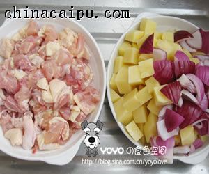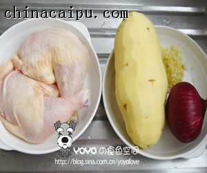 1、准备原料:鸡腿2只,土豆一大棵,元葱一个,蒜米适量,牛奶1l,肉骨汤1l,黄油40g,白糖20g,咖喱粉20g,盐适量;