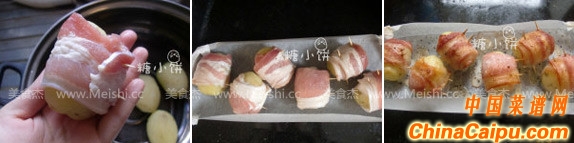 3.培根裁到适合土豆的宽度,卷在土豆上面