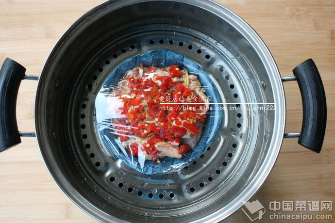 5. 将腌制好的鸡块铺在盘中,再均匀地浇上剁椒,然后用保鲜膜盖起来,用牙签在保鲜膜上戳几个小孔;