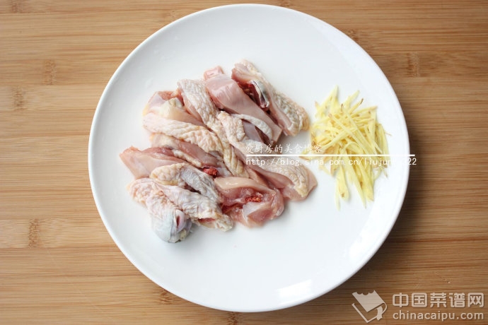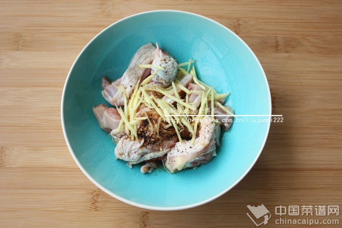 3. 鸡块中放入姜丝、料酒、酱油、盐、白糖、黑胡椒碎;