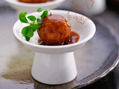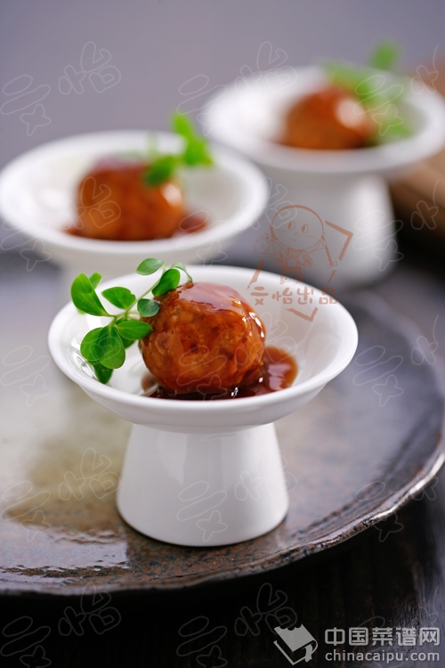 4)锅中加入鸡汤,将剩余生抽(10ml),老抽(3ml),盐(1克),糖(2克)放入汤中搅匀。最后放入丸子,用中火煮3分钟后,转大火淋入水淀粉收浓汤汁。