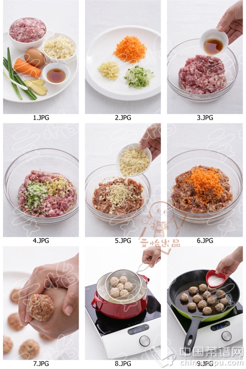 1)把香葱,姜片切成碎末,胡萝卜去皮切碎。肉馅中加入黄酒,生抽(5ml),老抽(2ml),盐(1克),葱姜末和鸡蛋搅匀后,再加入清水30ml搅拌直到肉馅上劲儿。
