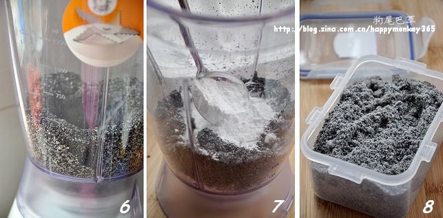 6.7.8. 晾凉的黑芝麻用搅拌机打成粉,再加入适量糯米粉,混合均匀后即可装入可密封的保鲜盒。