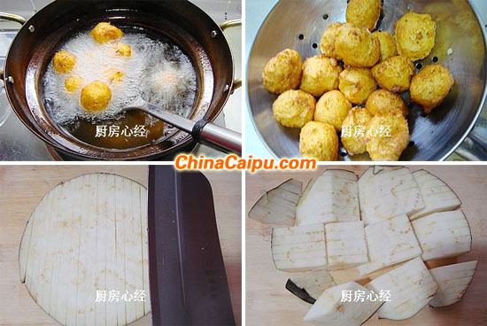 05.土豆:土豆是最不容易炸透的,所以先把土豆蒸熟,做成土豆丸子,再炸就容易熟了。
