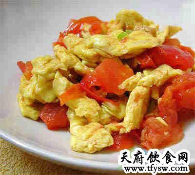 3)烧热植物油,放入番茄煸炒,再放入鸡蛋略炒,加入精盐、鸡精、白糖炒匀,最后用水淀粉勾芡,出锅装盘即成。