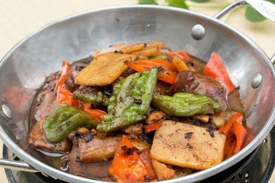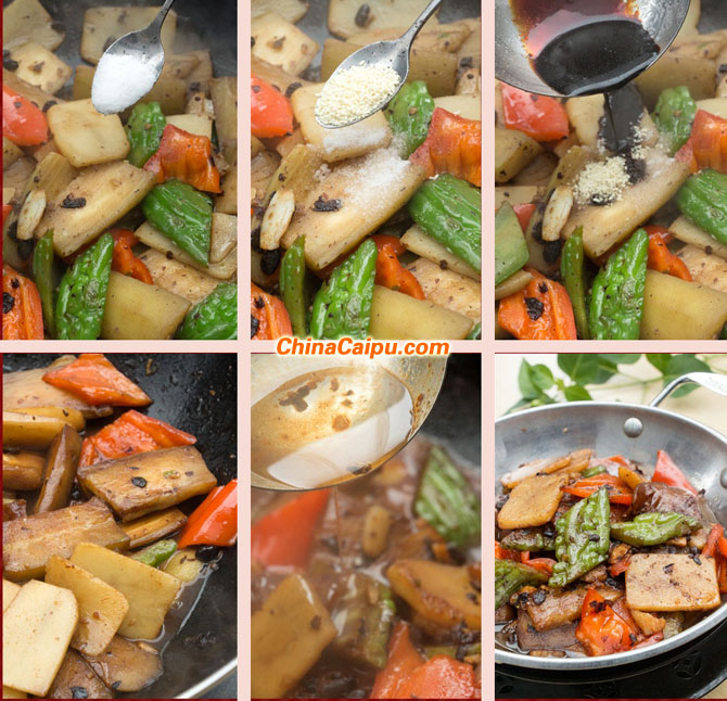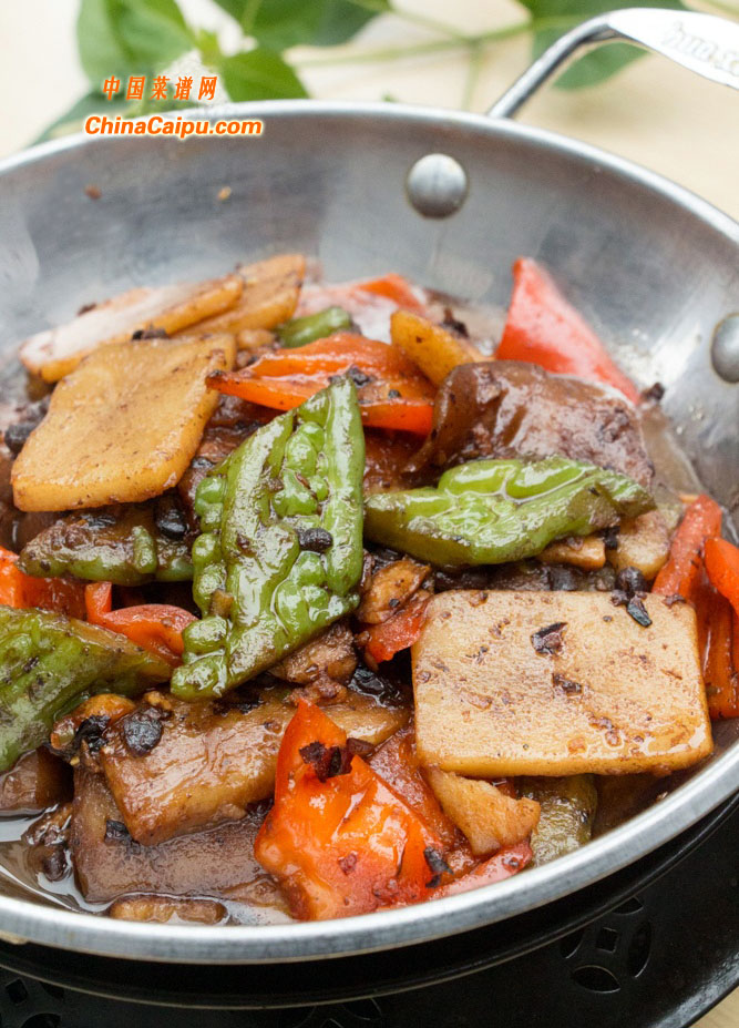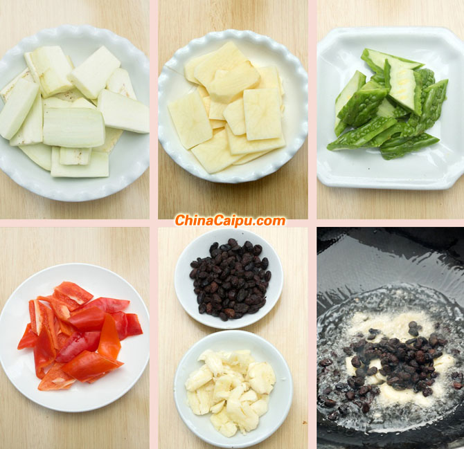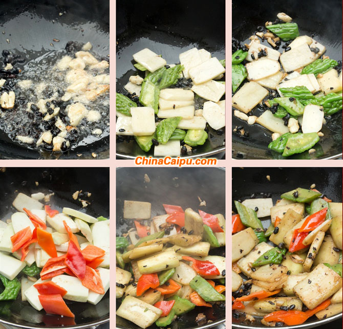 2、蒜瓣和豆豉炒香后,倒入土豆片和苦瓜一起煸炒,当炒到土豆片和苦瓜变色时,倒入茄子和红椒片一起煸炒,(茄子非常吃油,炒的时候不要不断加油,可顺着锅边淋少量的水,茄子很快就会软掉),直到把几样蔬菜都炒软。