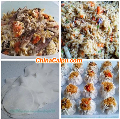 2.炒锅上火放入少量的油投入葱姜末,放入香菇丁,胡萝卜丁,茶干丁,加酱油,糖、醋、盐煸炒一会,然后放入水,待锅内卤汁沸腾倒入蒸好的糯米,收汤后放入蟹肉,拌匀成烧卖馅(我把泡香菇的水都加进去了)。