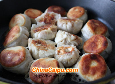 6.平底锅刷油,放入包子,洒上水,小火焖一会儿,等到水收干了翻面,待两面都煎黄了就是熟了。